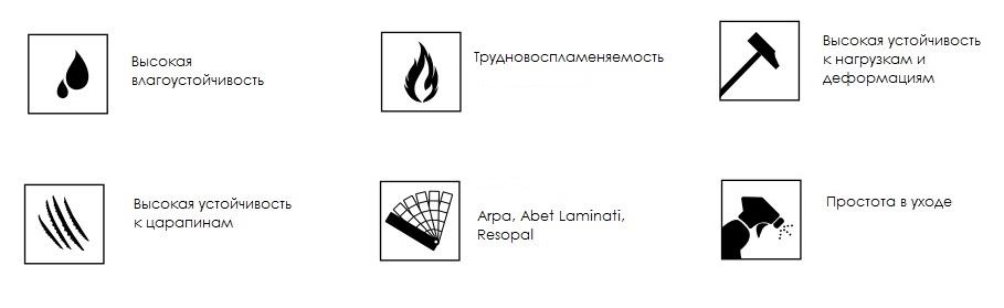 Высокие технические показатели данного материала прекрасно дополняются коллекциями каменных и древесных декоров и фактур Resopal, Abet Laminati, Arpa.